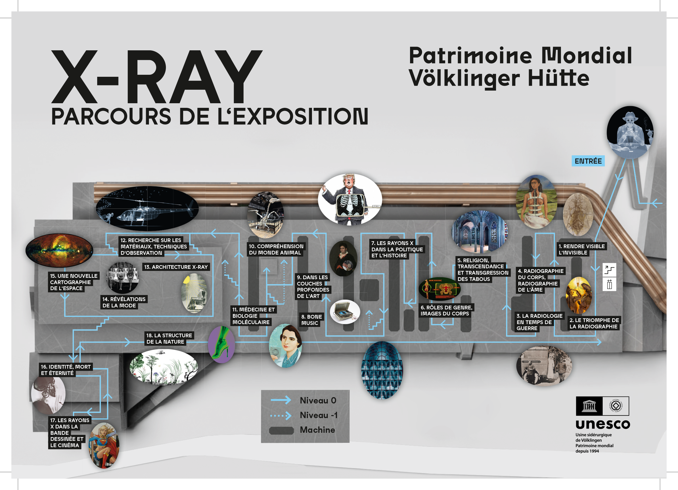 Cette fascination reste intacte jusqu ´à aujourd'hui, comme le montre le parcours X-RAY conçu comme un paysage expérimental : il réunit dans la cathédrale industrielle de la salle des soufflantes une chapelle radiographique de Wim Delvoye, un labyrinthe transparent en briques de Cris Bierrenbach, un podium avec des vêtements radiographiques et un cinéma pour les films X-RAY.